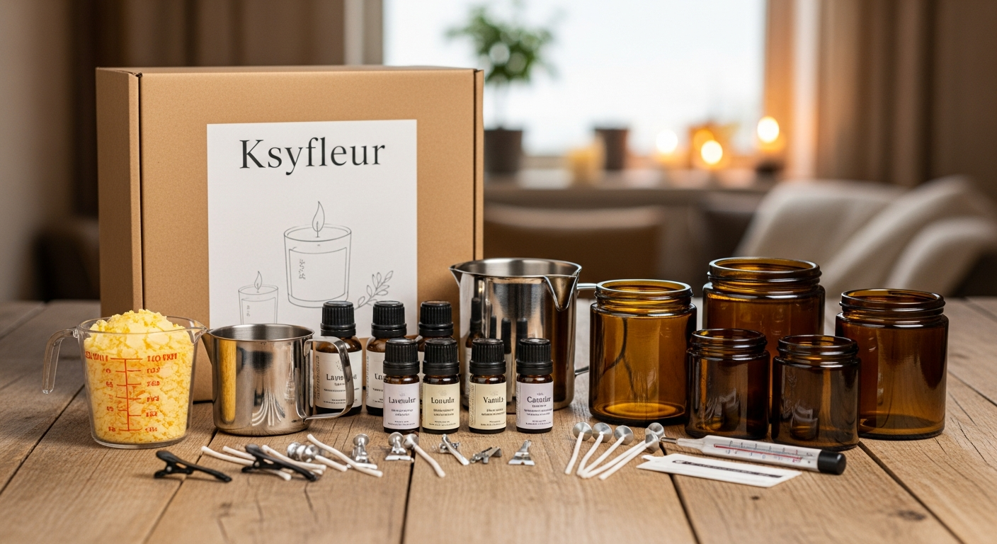 Набор для свечеварения включает основные инструменты: кастрюлю или ёмкость для плавления воска объёмом 1-3 литра, термометр с диапазоном до 200 °C, формы для свечей разных размеров, фитили, центрирующие устройства, мерный стакан, весы с точностью до 1 грамма и вспомогательные приспособления для фиксации и перемешивания. Комплект дополняют материалы - различные виды воска, красители и ароматизаторы.